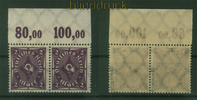 Deutsches Reich Mi # 224 aa OR P postfrisch im waagerechten Oberrrandpaar geprüft Infla Berlin 2 Mark Posthorn ohne Unterdruck dunkelpurpurviolett Plattendruck waagerrechtes Oberrandpaar postfrisch bestens geprüft Infla Berlin Erhaltung siehe Scan