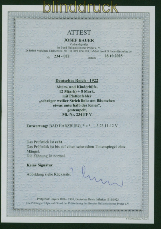 Deutsches Reich Mi # 234 PF V gestempelt Fotoattest Bauer BPP 12 + 8 Mark Alters- und Kinderhilfe gestempelt mit Plattenfehler V: schräger weißer Strich links am Bäumchen etwas unterhalb des Knies Fotoattest Bauer BPP: ".... Prüfstück ist echt, Tintenspiegel, Zähnung normal" Erhaltung siehe Scan