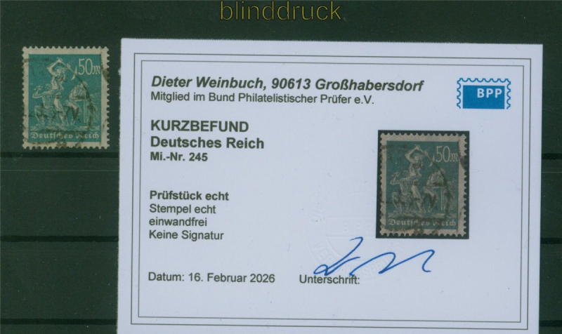 Deutsches Reich Mi # 245 gestempelt 50 Mark Bergarbeiter Kurzbefund Weinbuch 50 Mark Bergarbeiter nach links gestempelt Kurzbefund Weinbuch: ".... echt und einwandfrei" Erhaltung siehe Scan