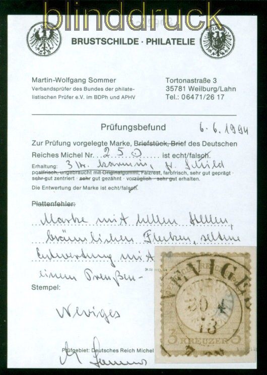 Deutsches Reich Mi # 25 gestempelt 3 Kreuzer Preussen-Stempel Neviges Fotobefund Sommer BPP 3 Kreuzer großer Schild Prüfungsbed´fund Sommer BPP: ".... ist echt, farbfrisch, sehr gur geprägt, gut zentriert, gut gezähnt, helle Stellen, bräunliche Flecken, Entwertung mit einem Preussen-Stempel Neviges Erhaltung siehe Scan