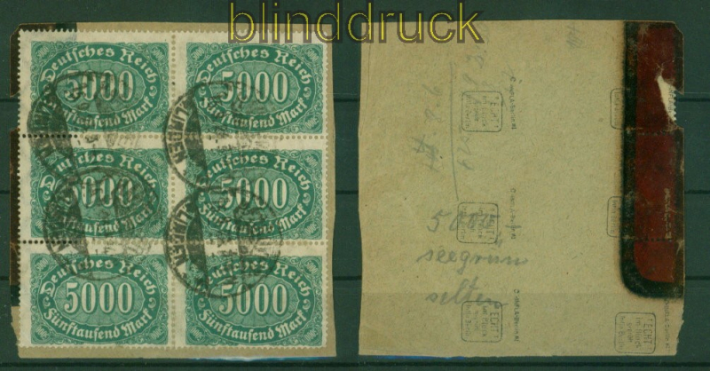 Deutsches Reich Mi # 256 c gestempelter 6er-Block geprüft Infla Berlin 5000 Mark Queroffset opalgrün als 6er-Block gestempelt auf Briefstück geprüft Infla Berlin Erhaltung siehe Scan
