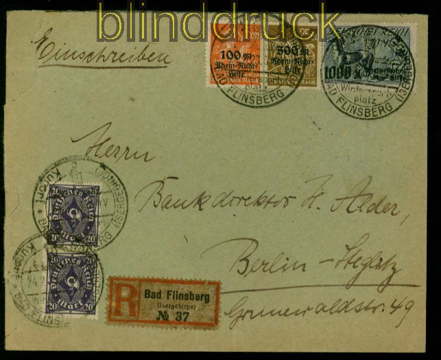 Deutsches Reich Mi # 258/60 MiF R-Brief SSt. Bad Flinsberg nach Berlin Rhein-Ruhr-Hilfe mit Zusatzfrankatur auf Einschreiben aus Bad Flinsberg 24.2.1923 nach Berlin-Steglitz Erhaltung siehe Scan