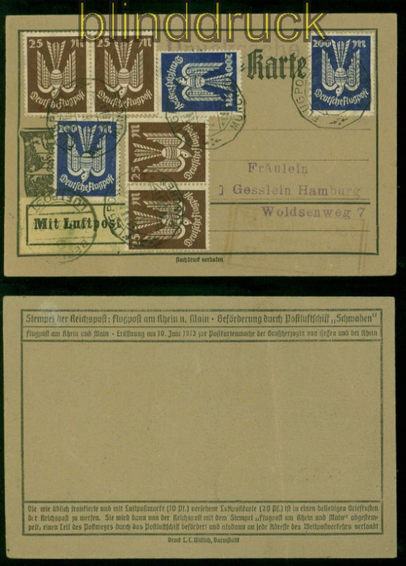 Deutsches Reich Mi # 265 (4) und 267 (3) MiF auf LuPo-DS-Karte München 23.8.1923 nach Hamburg 4 x 25 Mark und 3 x 200 Mark Flugpostmarken Holztaube (III) ohne Unterdruck auf alter Rhein-Main-Flugpostkarte als Luftpost-Drucksachenkarte mit Flugpost gelaufen aus München 23.8.1923 nach Hamburg mit Luftpostdurchgangsstempel Berlin und Luftpostbestätigunggsstempel Berlin Karte senkrecht gefaltet (durch eine 25 Mark-Marke) Erhaltung siehe Scan