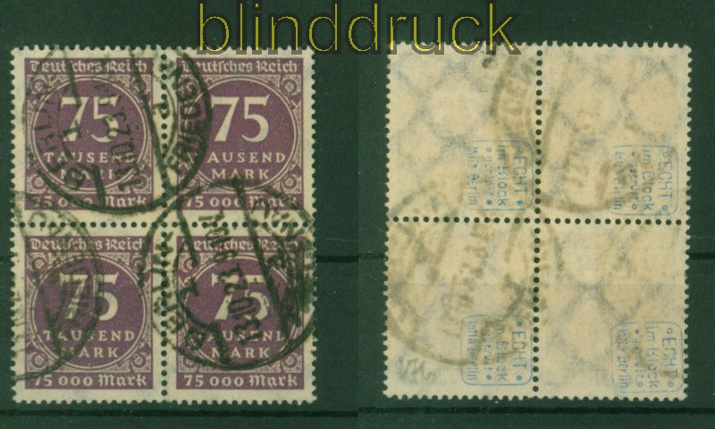 Deutsches Reich Mi # 276 gestempelt im 4er-Block geprüft Infla Berlin 75 000 Mark Ziffern im Kreis Wasserzeichen 2 im 4er-Block gestempelt geprüft Infla Berlin Erhaltung siehe Scan