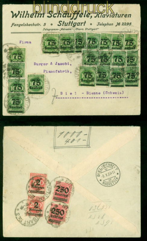 Deutsches Reich Mi # 287 (7), 288 (13), 295 (2) und 309 (2) Mischfrankatur Stuttgart 2.10.1923 portogerechte Mischfrankatur von 24 Marken vorder- und rückseitig auf Auslands-Firmenbedarfsbrief gelaufen aus Stuttgart 2.10.1923 nach Biel in der Schweiz Erhaltung siehe Scan