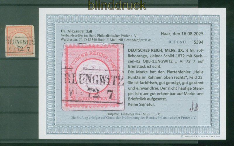 Deutsches Reich Mi # 3 X gestempelt 1/2 Groschen Fotobefund Dr. Zill BPP 1/2 Groschen kleiner Schild gestempelt Oberlungwitz mit Plattenfehler X: helle Punkte im Rahmen oben rechts Fotobefund Dr. Zill BPP: "... farbfrisch, gut geprägt, gut gezähnt uind einwandfrei" Erhaltung siehe Scan