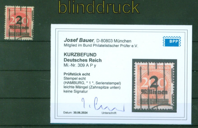 Deutsches Reich Mi # 309 A P Y gestempelt geprüft Kurzbefund Bauer BPP Aufdruckmarke 2 Mio. auf 200 Mark mit liegenden Wasserzeichen gestempelt Kurzbefund Bauer BPP: echt, leichte Mängel Erhaltung siehe Scan