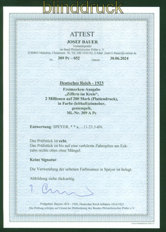 Deutsches Reich Mi # 309 A P c gestempelt geprüft Fotoattest Bauer BPP Aufdruckmarke 2 Mio. auf 200 Mark orangerot gestempelt Fotoattest Bauer BPP: ".... ist echt, eine verkützte Zahnspitze Eckzahn oben rechts " Erhaltung siehe Scan