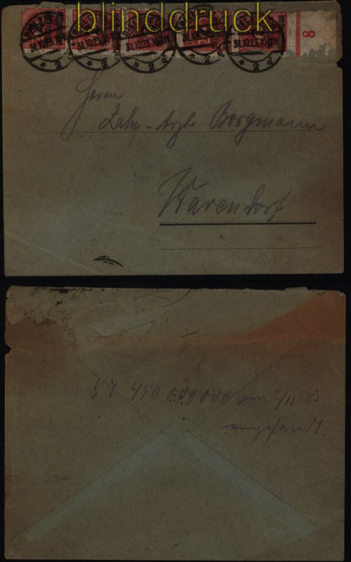 Deutsches Reich Mi # 309 B (5) MeF auf Fernbrief Bielefeld 31.10.1923 nach Warendorf Aufdruckmarke 2 Millionen auf 200 Mark durchstochen seltene portogerechte Mehrfachfrankatur von 5 Marken vom Letztag dieser Perioide auf Fernbrief aus Bielefeld 31.10.1923 nach Warendorf alle Marken sind mehr oder weniger beeinträchtigt und sind teilseise so auch verklebt worden hoher Katalogwert von 1500,00 Euro Erhaltung siehe Scan