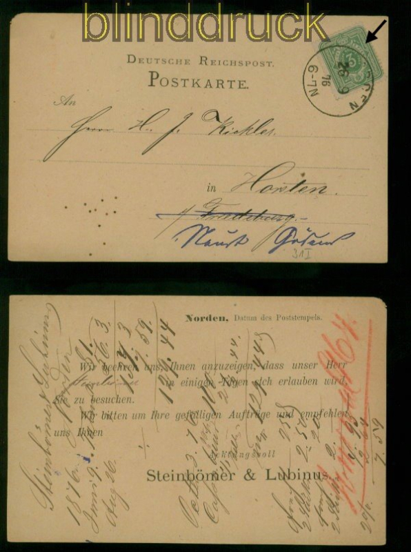 Deutsches Reich Mi # 31 I EF auf Drucksache mit Plattenfehler Norden 26.9.1876 nach Horten 3 Pfennige Ziffer im Oval grün portogerechte Einzelfrankatur auf Drucksache Marke mit Plattenfehler I: Guilloche über rechtem Schraffendreieck gebrochen Erhaltung siehe Scan