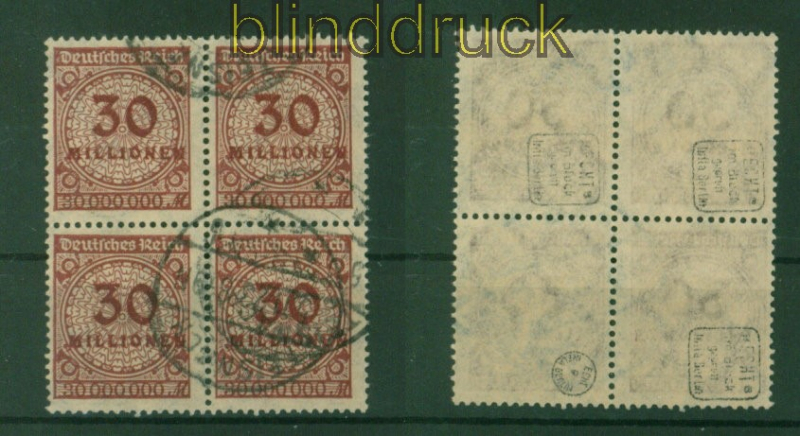 Deutsches Reich Mi # 320 A gestempelt im 4er-Block geprüft Infla Berlin 30 Millionen Mark Rosettenmuster gezähnt im 4er-Block gestempelt geprüft Infla Berlin Erhaltung siehe Scan