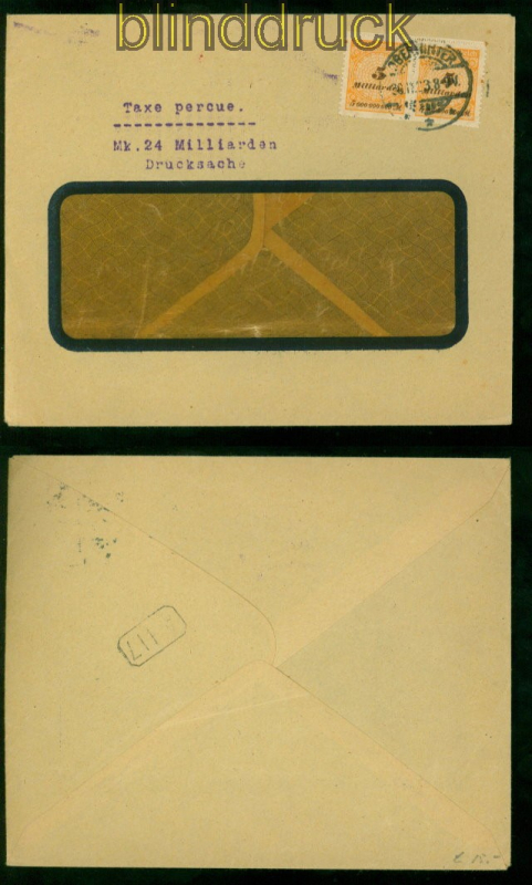 Deutsches Reich Mi # 327 B (2) MeF Teilbar auf Auslands-Drucksache Oberwinter 30.11.1923 5 Mrd durchstochen als waagerechtes Paar als Teilbar-Frankierung mit Gebühr bezahlt über 24 Milliarden Mark auf Fensterbriefumschlag gelaufen als Auslands-Drucksache aus Oberwinter 30.11.1923 vermutlich in die Niederlande erkennbar an dem rückseitig abgeschlagenen Briefträgerstempel vom letzten Tag vor der Gültigkeit der neuen Rentenmarkwerten die beiden 5 Milliarden-Marken sind 4fach aufgewertet, die Barfreimachung ist genau der Fehlbetrag zum portogerechten Porto von 64 Milliarden Mark ein schöner Beleg Erhaltung siehe Scan