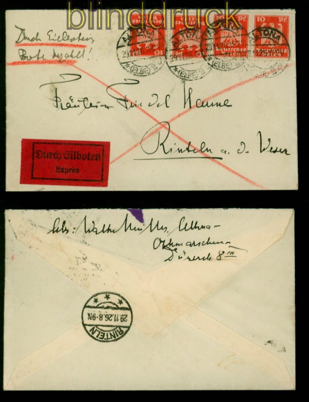 dt. Reich Mi # 357 (4) MeF Eil-Brief Altona 29.11.1926 nach Rinteln (54455)