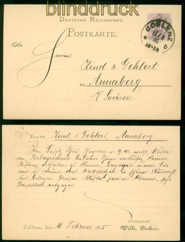 Deutsches Reich Mi # 40 EF Postkarte Coblenz Klauckestempel 1885 nach Annaberg 5 Pfennige Ziffer im Oval Einzelfrankatur EF aus Strassburg mit Coblenz 11.2.1885 nach Annaberg Erhaltung siehe Scan