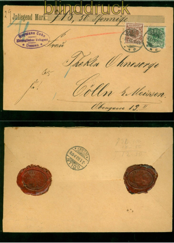 dt. Reich Mi # 46 und 50 MiF auf Wertbrief Dessau 3.1.1900 nach Cölln (57331)
