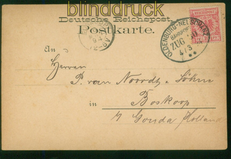 Deutsches Reich Mi # 47 EF Bahnpost Oldenburg-Neuschanz 1894 nach Boskop in Holland 10 Pfg. Pfennig Krone/Adler als Einzelfrankatur EF auf Auslandspostkarte gelaufen mit Bahnpost Oldenburg-Neuschanz Zug 30 4.3.1894 nach Boskop in Holland Erhaltung siehe Scan