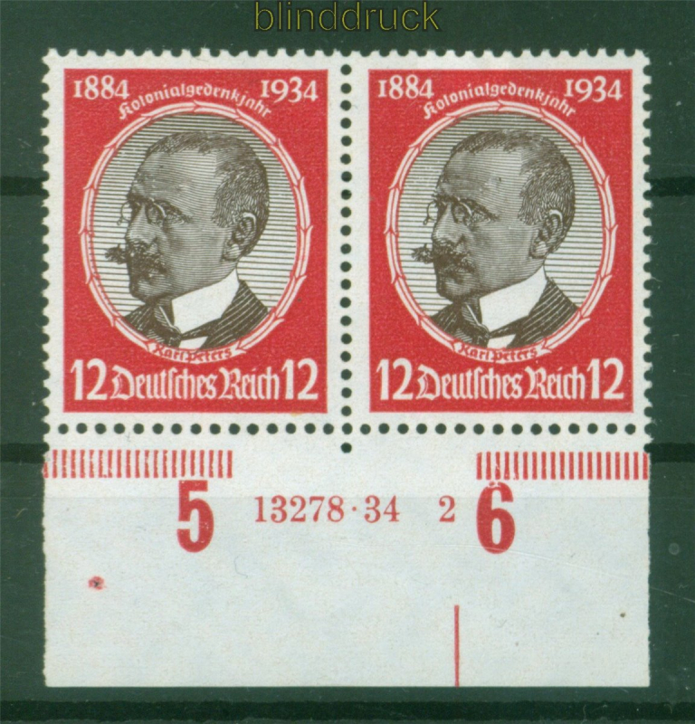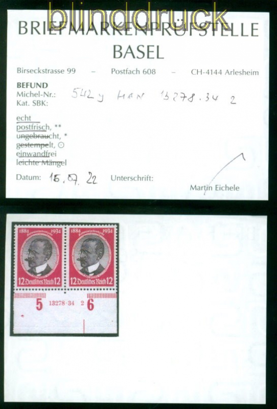 Deutsches Reich Mi # 542 y HAN postfrisch waagerechtes Paar 12 Pfg. Kolonialforscher geprüft 12 Pfennig Kolonialgedenkfeier: Kolonialforscher als waagerechtes Paar vom Unterrand (ungefaltet) mit HAN Hausauftragsnummer 13278.34 2 postfrisch Prüfbefund der Briefmarkenprüfstelle BaseL: echt, postfrisch und einwandfrei Erhaltung siehe Scan