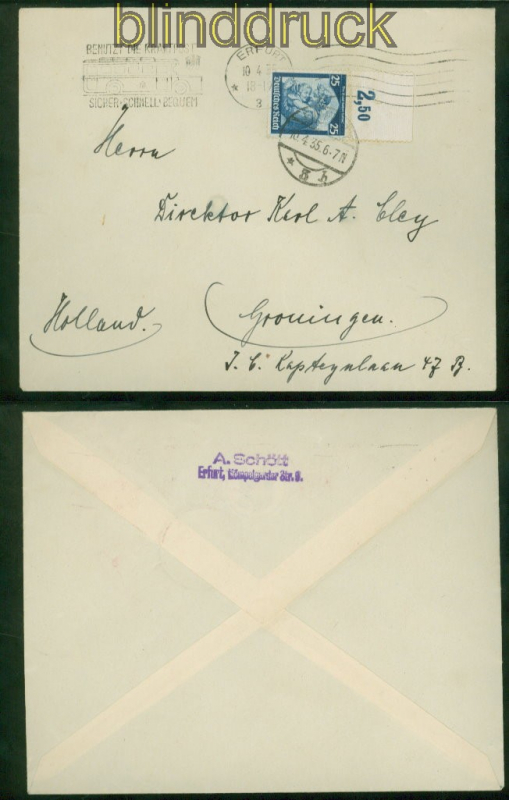 Deutsches Reich Mi # 568 EF Oberrand Auslandsbrief Erfurt 1935 nach Holland 25 Pfennig Saarabstimmung vom Oberrand als portogerechte Einzelfrankatur EF auf Auslandsbrief aus Erfurt 10.4.1935 nach Groningen in Holland Erhaltung siehe Scan
