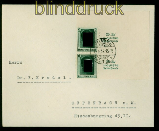 Deutsches Reich Mi # 648 (2) MeF auf Ortsbrief Offenbach 15.8.1937 6 Pfennig aus Blockausgabe Kulturförderung Einzelmarke aus Block 9 aus überfrankierten Ortsbrief Offenbach 15.8.1937 Erhaltung siehe Scan