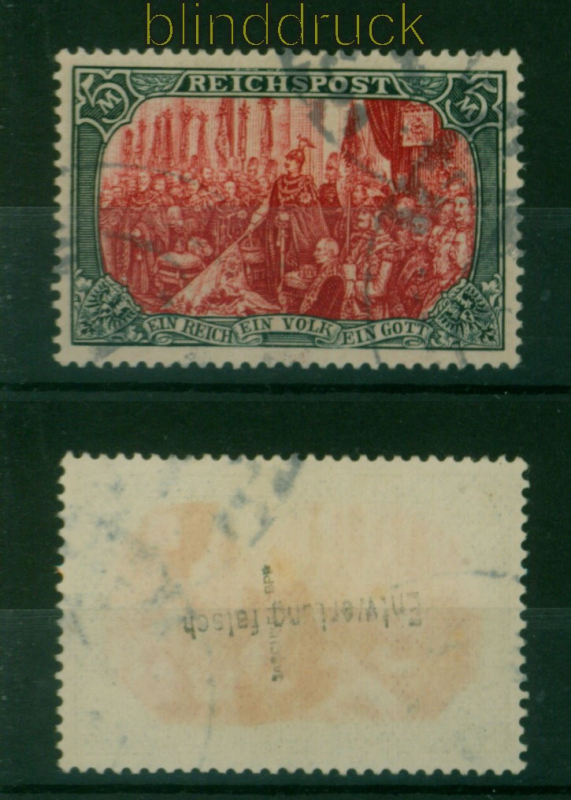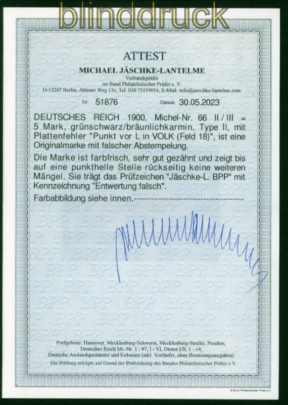 Deutsches Reich Mi # 66 II/III Plattenfehler gestempelt Fotoattest Jäschke-L. BPP 5 Mark Germania Reichspost Type II mit Plattenfehler III: Punkt vor L in Volk (Feld 18) gestempelt mit Falschstempel Fotoattest Jäschke-Lantelme BPP: ".... Originalmarke mit falscher Abstempelung, farbfrisch, sehr gut gezähnt, punkthelle Stelle Erhaltung siehe Scan