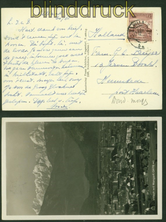 Deutsches Reich Mi # 668 EF auf Auslandspostkarte sw-AK Villach 1938 15 Pfg. Turn- und Sportfest in Breslau portogerechte Einzelfrankatur EF auf Auslandspostkarte aus Villach 30.8.1938 nach Haarlem sw-Foto-AK Villach mit Mangart Erhaltung siehe Scan