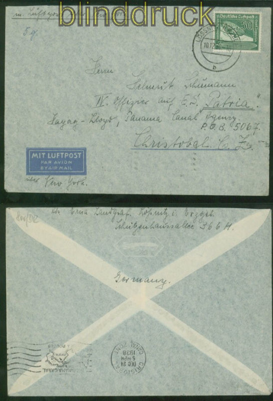 Deutsches Reich Mi # 670 EF Auslands-LuPo-Brief Lössnitz 1938 in die Canal-Zone 50 Pfennig Zeppelin portogerecht auf Auslands-Luftpost-Brief mit Leitvermerk über New York gelaufen aus Lössnitz 10.12.1938 nach Christobal in der Canal-Zone Adressat ist ein IV Offizier auf der E.S. Patria Hapag Lloyd Erhaltung siehe Scan