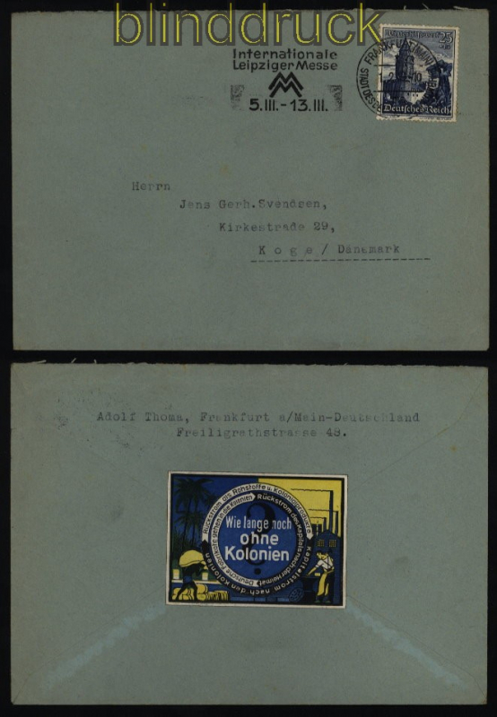 Deutsches Reich Mi # 682 EF Auslandsbrief Frankfurt 1939 nach Dänemark Vignette 25 Pfennig Winterhilfswerk 1938 WHW portogerecht auf Auslandsbrief gelaufen aus Frankfurt/Main 1.2.1939 nach Koge in Dänemark rückseitig mit Vigentte: Wie lange noch ohne Koloinien Erhaltung siehe Scan