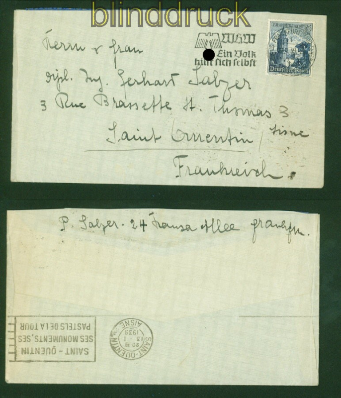 Deutsches Reich Mi # 682 EF Auslandsbrief Frankfurt 1939 nach Frankreich 25 Pfennig Winterhilfswerk 1938 WHW portogerecht auf Auslandsbrief gelaufen aus Frankfurt/Main 12.1.1939 nach Saint Quentin in Frankreich Ankunftsstempel Erhaltung siehe Scan