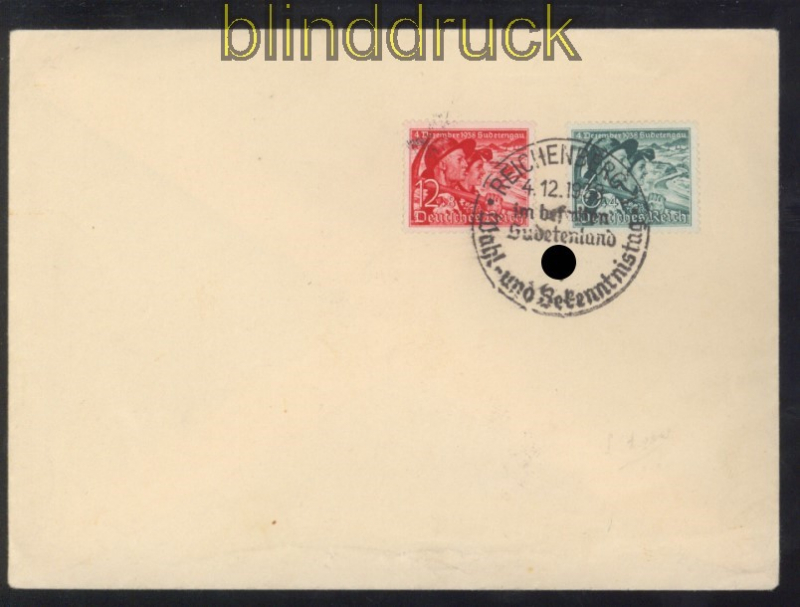 Deutsches Reich Mi # 684 x und 685 y SSt. Vorlageumschlag senkrechte Gummiriffelung Abstimmung im Sudetenland komplette Ausgabe Mi # 684 mit senkrechter Gummiriffelung (gest. 65,00 Euro) mit Sonderstempel SSt. Reichenberg 4.12.1938 auf Vorlageumschlag Erhaltung siehe Scan