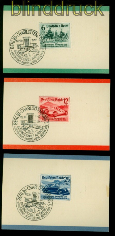Deutsches Reich Mi # 686/88 FDC drei Reklamekarten Automobil- und Motorrad-Ausstellung Internationale Automobil- und Motorrad-Ausstellung komplette Ausgabe drei Werbekarten der Deutschen Bank mit Sonderstempel SSt. vom Ersttag FDC Erhaltung siehe Scan