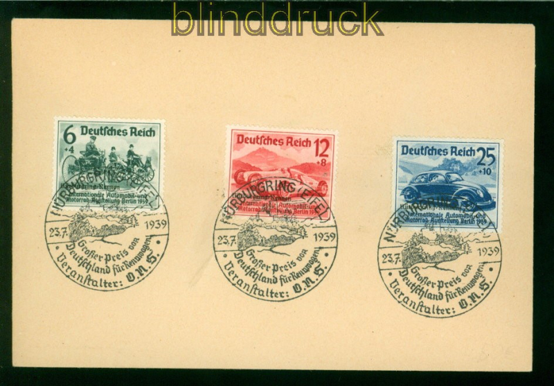 Deutsches Reich Mi # 695/97 Nürburgring-Rennen mit SSt auf Vorlageumschlag Nürburgring-Rennen komplette Ausgabe mit Sonderstempel auf Vorlageumschlag gestempelt Erhaltung siehe Scan