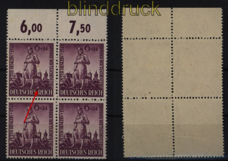 Deutsches Reich Mi # 819 II postfrisch Plattenfehler 6 + 24 Pfg. 400. Todestag Peter Henlein mit Plattenfehler II: großer runder Fleck über S R postfrisch im 4er-Block Erhaltung siehe Scan