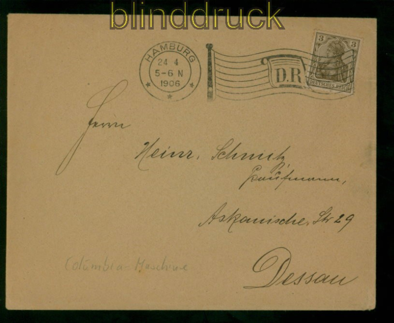 Deutsches Reich Mi # 84 I EF mit Columbia-Stempel Hamburg 1908 auf Drucksache nach Dessau 3 Pfennig Germania Friedensdruck Einzelfrankatur EF auf Drucksache entwertet mit Columbia-Stempel gelaufen aus Hamburg 1908 nach Dessau Erhaltung siehe Scan