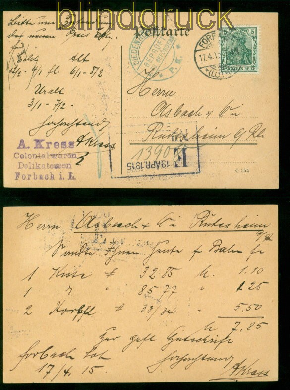 Deutsches Reich Mi # 85 EF Forbach i. E. Zensur Diedenhofen 1915 nach Rüdesheim frankiert mit 5 Pfg,. Germania auf Postkarte mit Zensur Diedenhofen geprüft zu befördern gelaufen aus Forbach (Lothr.) 17.4.1915 nach Rüdesheim Erhaltung siehe Scan