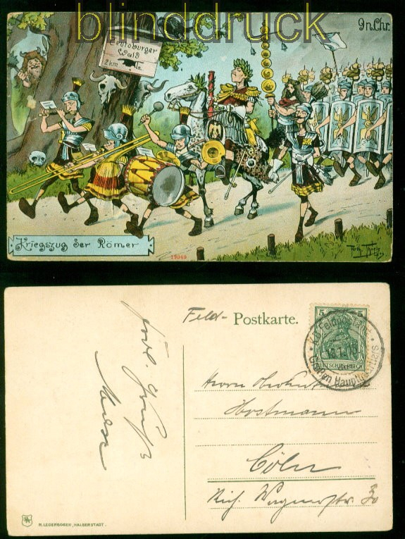 Deutsches Reich Mi # 85 II EF 5 Pfennig Germania Karikatur-AK Siegeszug der Römer 5 Pfennig Germania Kriegsdruck als Einzelfrankatur EF auf Karikatur-Ansichtskarte Siegezug der Römer , 9 n. Chr. Teutoburger Wald 2 km Marke entwertet mit Stempel K.D. Feldpostamt des Großen Hauptquartiers 18.1.1915 nach Cöln Erhaltung siehe Scan
