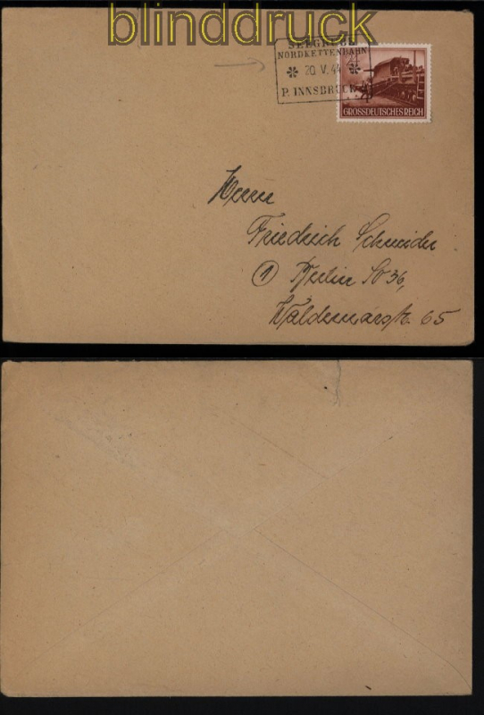 Deutsches Reich Mi # 883 EF Bahnpost Seegrube Nordkettenbahn 1944 Innsbruck 24 Pfennig Heldengedenktag (II) als portogerechte Einzelfrankatur EF auf Fernbriefmit Bahnpost Seegrube Nordkettenbahn 20.V.1944 P. Innsbruck 2 gelaufen nach Berlin obe kleiner Einriß von ca. 1,5 cm Erhaltung siehe Scan
