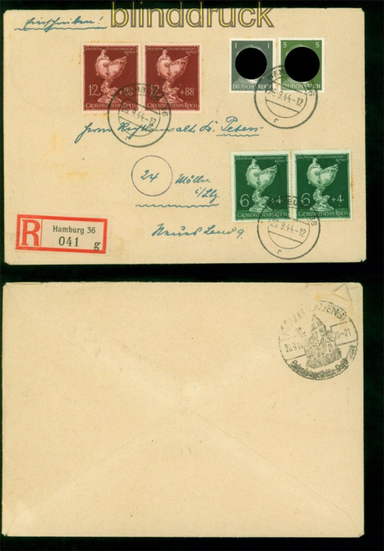 Deutsches Reich Mi # 902/03 (2) in MiF R-Brief Hamburg 26.9.1944 nach Mölln Deutsche Gesellschaft für Goldschmiedekunst komplette Ausgabe in waagerechten Paaren in Mischfrankatur auf R-Brief Hamburg 26.9.1944 nach Mölln Ankunftsstempel Erhaltung siehe Scan