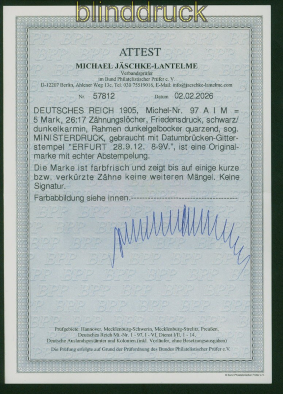 Deutsches Reich Mi # 97 A I M gestempelt Ministerdruck Fotoattest Jäschke-L. BPP 5 Mark Germania Friedensdruck als sogenannter Ministerdruck gestempelt Fotoattest Jäschke BPP: ".... Originalmarke mit echter Abstempelung, farbfrisch, einige kurze bzw. verkürzte Zähne" Erhaltung siehe Scan