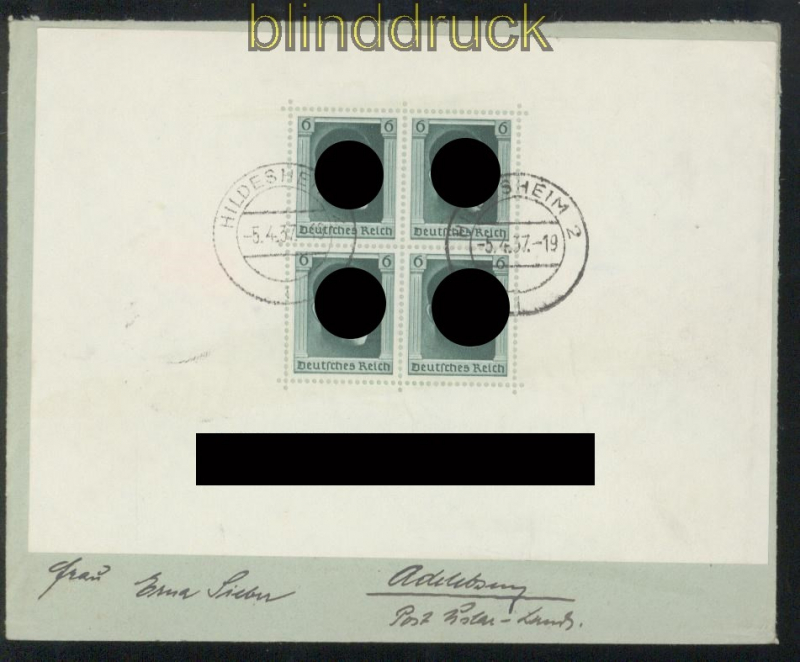 Deutsches Reich Mi # Bl. 7 EF FDC Geburtstagsblock Ersttagsbrief Blockausgabe zum 48. Geburtstag gezähnt portogerecht auf adressierten Erttagsbrief mit Tagesstempel vom 5.5.1937 ein seltener Ersttagsbrief Erhaltung siehe Scan