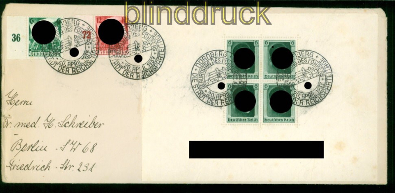 Deutsches Reich Mi # Bl. 7 MiF mit 632/33 SSt. Nürnberg 1937 nach Berlin Blockausgabe zum 48. Geburtstag gezähnt mit Zusatzfrankatur auf Fernbrief aus Nürnberg 20.4.1937 nach Einfeld-Neumünster Erhaltung siehe Scan