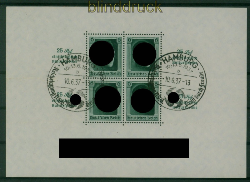 Deutsches Reich Mi # Block 9 Sonderstempel Hamburg Kulturspende-Block Kulturspende-Block Sonderstempel Hamburg 10.6.1937 Block links in der Zähnung bis zum Stempel angetrennt Erhaltung siehe Scan