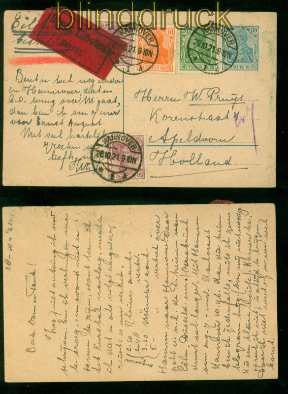 Deutsches Reich Mi # GSK P 120 B MiF Auslands-Eilboten-Karte Hannover 28.10.1921 3Ganzsachenkarte 30 Pfennig Germania blau mit Zusatzfrankatur als Auslands-Eilboten-Karte aus Hannover 28.10.1921 nach Apeldoorn in Holland Erhaltung siehe Scan