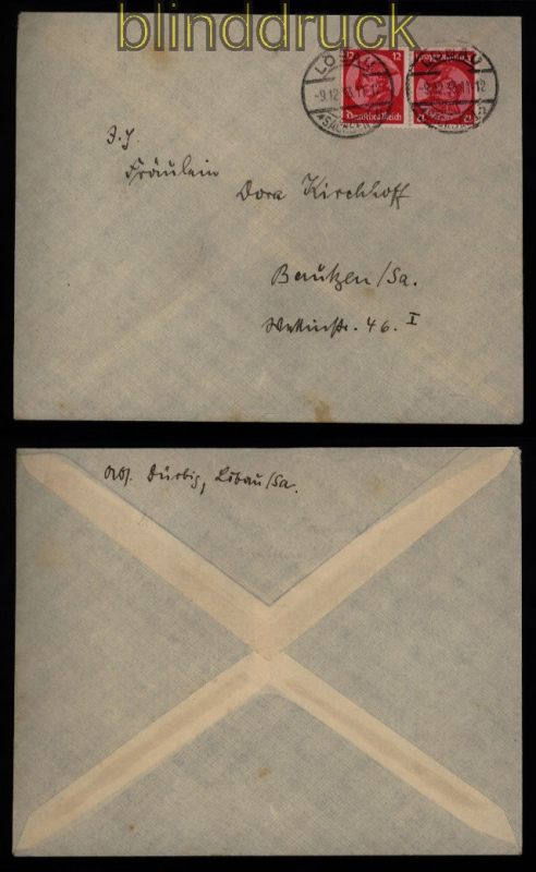 Deutsches Reich Zusammendrucke Mi # K 18 EF portogerecht Fernbrief Löbau 1933 nach Bautzen 12 Pfg. Friedrich der Große als Kehrdruckpaar als portogerecht auf Fernbrief als Doppelbrief gelaufen aus Löbau 9.12.1933 nach Bautzen Erhaltung siehe Scan
