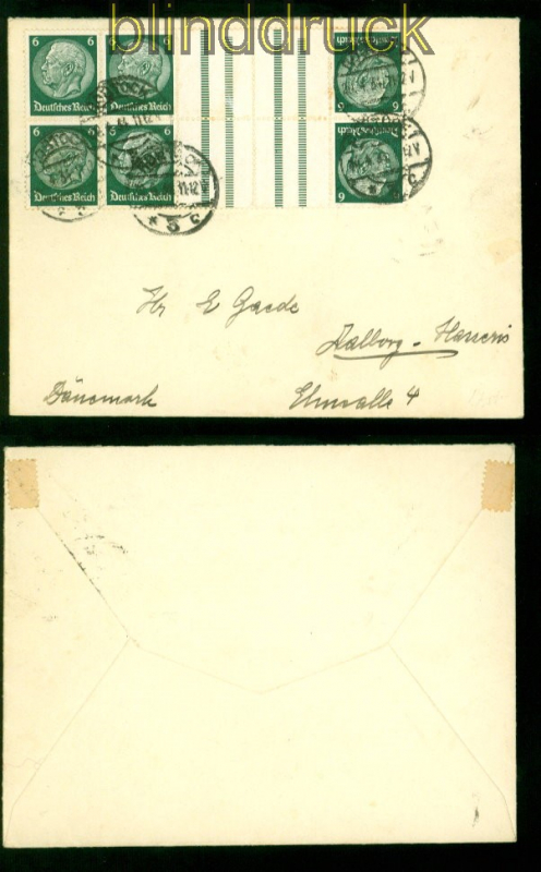 Deutsches Reich Zusammendrucke Mi # KZ 18 (2) MeF auf Auslandsbrief aus Rostock 20.4.1934 nach Dänemark 6 Pfg. Hundenburg Wasserzeichen Waben Wz 2 zwei Kehrdruckpaare mit Zwischensteg und weiteren Marken auf Auslandsbrief aus Rostock 20.4.1934 nach Aalborg in Dänemark Rückseite nicht beschrieben Erhaltung siehe Scan