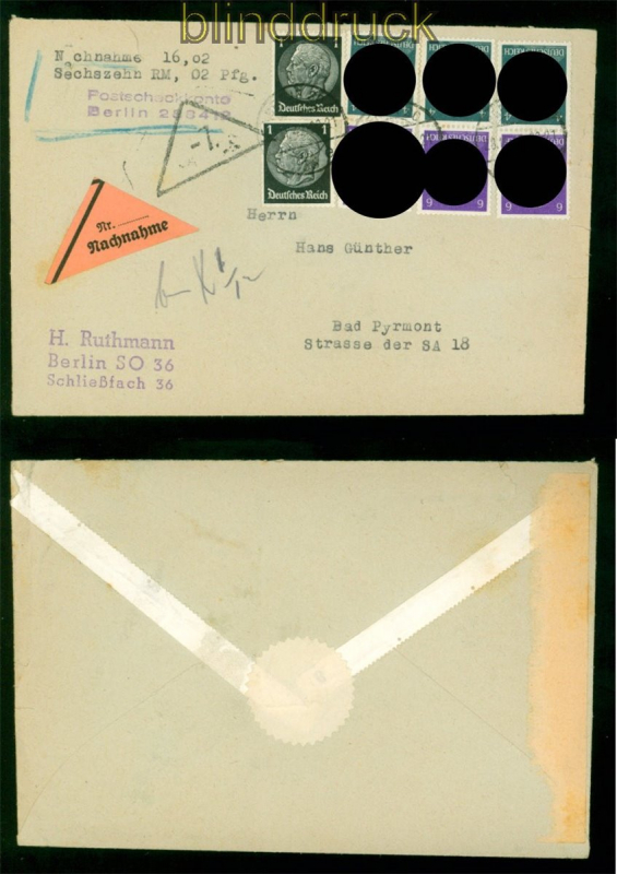 Deutsches Reich Zusammendrucke Mi # S 292 (3) MiF mit 512 (2) NN-Brief Berlin 28.11.1942 nach Bad Pyrmont drei senkrechte Zusammendrucke in Mischfrankatur mit zwei 1 Pfg. Hindenburg-Werten auf Nachnahmebrief aus Berlin 28.11.1942 nach Bad Pyrmont Erhaltung siehe Scan