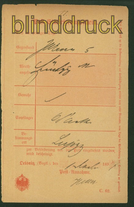 Deutsches Reich Oelsnitz Post-Einlieferungsschein 1891 Post-Einlieferungsschein aus Oelsnitz 1891 nach Leipzig Erhaltung siehe Scan