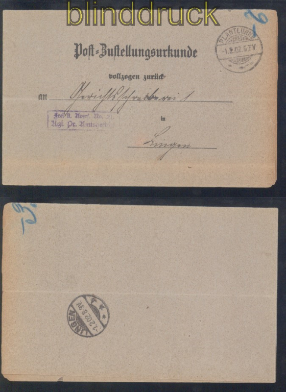 Deutsches Reich Postzustellungsurkunde Plantlünne 1.2.1902 nach Lingen Postzustellungsurkunde vollzogen zurück aus Plantlünne 1.2.1902 nach Lingen Erhaltung siehe Scan