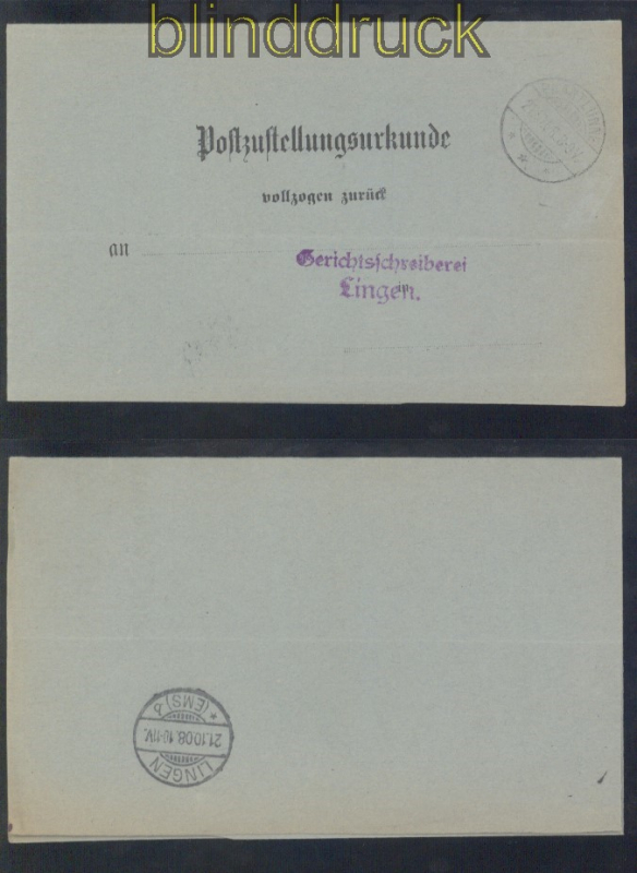 Deutsches Reich Postzustellungsurkunde Plantlünne 21.10.1908 nach Lingen Postzustellungsurkunde vollzogen zurück aus Plantlünne 21.10.1908 nach Lingen Erhaltung siehe Scan