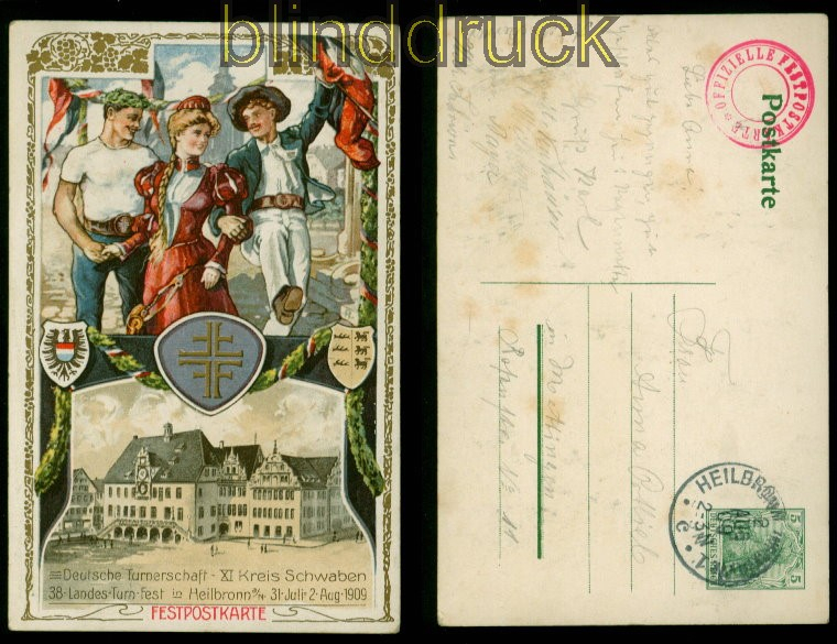 Deutsches Reich Privat-GSK PP 27 C 105 Landesturnfest Heilbronn 1909 5 Pfg. Germania Privat-Ganzsachenkarte offizielle Festpostkarte Deutsche Turnerschaft - XI Kreis Schwaben 38. Landes-Turn-Fest in Heilbronn a/N 31. Juli - 2 Aug. 1909 offizielle Postkarte Karte gelaufen aus Heilbronn 2.8.1909 nach Mettingen gute Erhaltung siehe Scan
