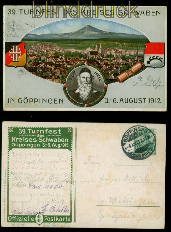 Deutsches Reich Privat-GSK PP 27 C 156 Turnfest des Kreises Schwaben 1912 5 Pfg. Germania Privat-Ganzsachenkarte offizielle Festpostkarte 39. Turnfest des Kreises Schwaben Göppingen 3.-6. August 1912 offizielle Postkarte Karte gelaufen aus Göppingen 4.8.1912 nach Mettingen gute Erhaltung siehe Scan